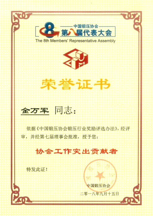 為表彰金萬軍先生對行業(yè)工作的支持,依據(jù)《中國鍛壓協(xié)會(huì)鍛壓行業(yè)獎(jiǎng)勵(lì)評選辦法》,經(jīng)中國鍛壓協(xié)會(huì)第七屆理事會(huì)批準(zhǔn),授予金萬軍同志“協(xié)會(huì)工作突出貢獻(xiàn)者”稱號。齊俊河監(jiān)事長一行向金萬軍同志頒發(fā)了獲獎(jiǎng)證書及獎(jiǎng)牌。