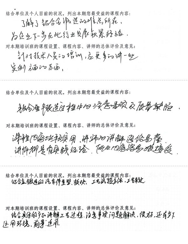 此次課程應(yīng)邀前來(lái)的企業(yè)有半數(shù)為之前未進(jìn)入鋁合金鍛造領(lǐng)域,準(zhǔn)備為企業(yè)下一步的轉(zhuǎn)型及拓展進(jìn)行技術(shù)儲(chǔ)備,培訓(xùn)后各企業(yè)代表紛紛表示收獲頗多,對(duì)下一步的布局與規(guī)劃有了方向,在技術(shù)層面上對(duì)于鋁合金鍛造可能出現(xiàn)的問(wèn)題也得到了拓展,達(dá)到了技術(shù)儲(chǔ)備的預(yù)期效果,也有企業(yè)認(rèn)為部分內(nèi)容上有些不合適,我們將根據(jù)企業(yè)的反饋,對(duì)后期開(kāi)展的研修班內(nèi)容上做出調(diào)整!