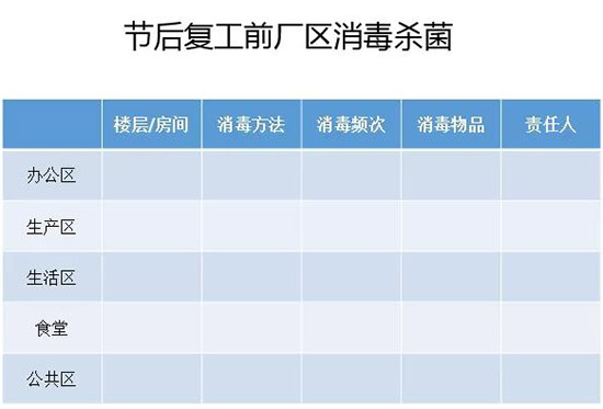 復(fù)工前工廠各個區(qū)域都必須進行消毒,殺菌處理,確保工廠內(nèi)部人員的防護安全,特別注意食堂就餐,早會、例會等人員聚集時。