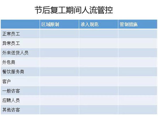根據(jù)疫情區(qū)域情況,制定返廠復(fù)工人流管控方案以及復(fù)工期間人流管控措施。