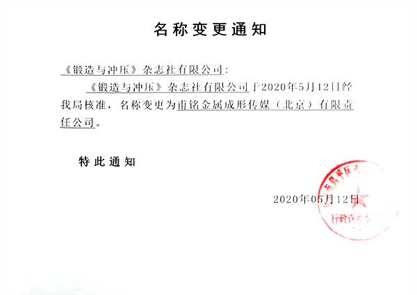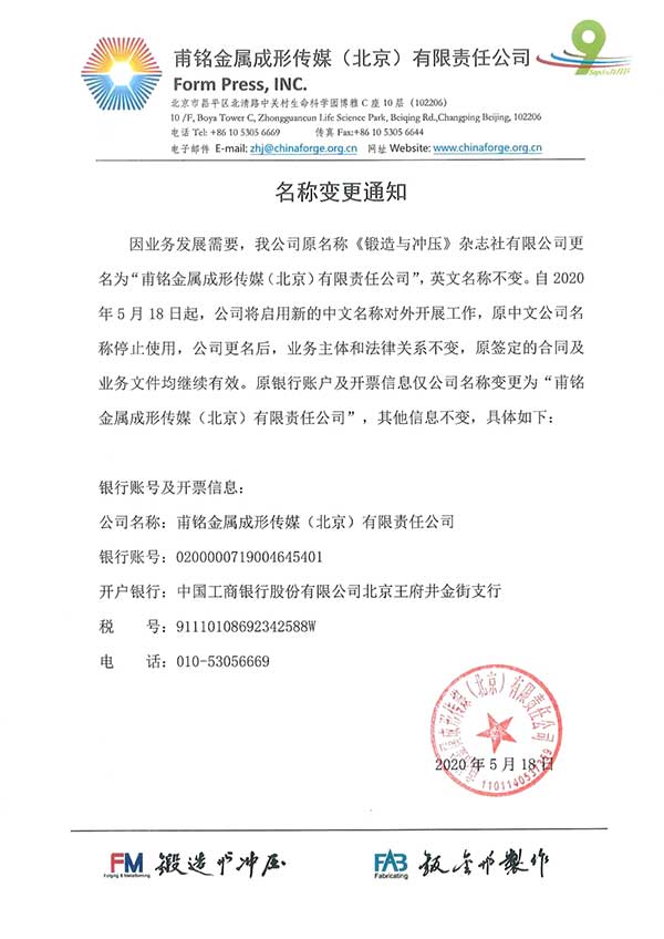 因業(yè)務發(fā)展需要,我公司原名稱《鍛造與沖壓》雜志社有限公司更名為“甫銘金屬成形傳媒(北京)有限責任公司”,英文名稱不變。自2020年5月18日起,公司將啟用新的中文名稱對外開展工作,原中文公司名稱停止使用,公司更名后,業(yè)務主體和法律關系不變,原簽定的合同及業(yè)務文件均繼續(xù)有效。原銀行賬戶及開票信息僅公司名稱變更為“甫銘金屬成形傳媒(北京)有限責任公司”,其他信息不變,具體如下: