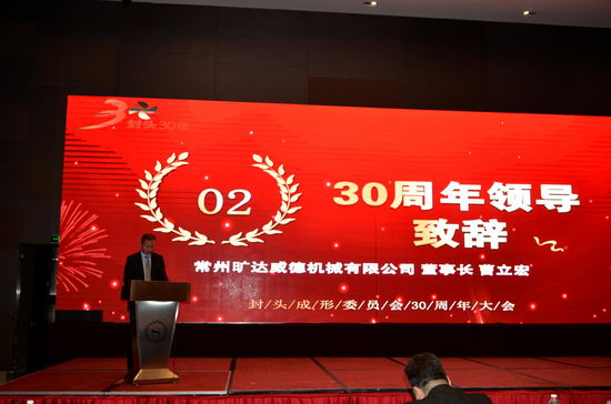 中國鍛壓協(xié)會副理事長、封頭成形委員會主任委員、常州曠達威德機械有限公司董事長曹立宏先生為慶典致辭。他表示30年來封頭行業(yè)發(fā)生了翻天覆地的變化,體現(xiàn)出國人的勤勞和智慧;封頭作為壓力容器的關鍵配套件,封頭行業(yè)的飛速發(fā)展,正解決著各行各業(yè)飛速發(fā)展的需求,影響各行各業(yè)發(fā)展的瓶頸,希望各位同仁緊跟時代步伐,綠色發(fā)展,打造行業(yè)品牌。