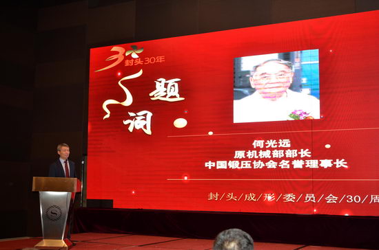 中國鍛壓協(xié)會理事長、江蘇太平洋精鍛科技有限公司董事長夏漢關先生,中國鍛壓協(xié)會輪值理事長、無錫鵬德汽車配件有限公司董事長談偉光先生,中國鍛壓協(xié)會輪值理事長、蘇州寶馨科技實業(yè)股份有限公司鈑金事業(yè)部總經(jīng)理羅勇先生,中國鍛壓協(xié)會執(zhí)行理事長兼秘書長張金先生,合肥合鍛智能制造股份有限公司董事長兼總經(jīng)理嚴建文先生,中國鍛壓協(xié)會封頭成形委員會特邀顧問李天林先生分別錄制視頻恭賀;中國鍛壓協(xié)會名譽理事長、原機械部部長何光遠老先生、封頭成形委員會主任委員及執(zhí)行委員等近30多位行業(yè)內(nèi)大咖也紛紛發(fā)來了賀詞祝賀!