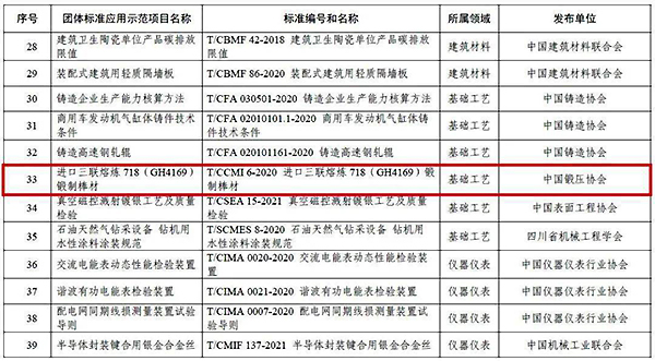 2021年12月30日,工業(yè)和信息化部公布111項2021年團體標準應用示范項目,中國鍛壓協會發(fā)布的 T/CCMI 6-2020《進口三聯熔煉718(GH4169)鍛制棒材》團體標準成功入選。
