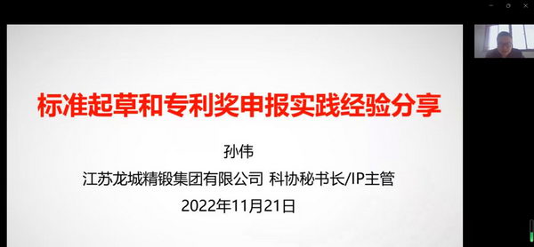 江蘇龍城精鍛集團(tuán)有限公司主管孫偉做了題為《標(biāo)準(zhǔn)起草和專利獎(jiǎng)申報(bào)實(shí)踐經(jīng)驗(yàn)分享》的報(bào)告。分享了企業(yè)標(biāo)準(zhǔn)制訂方面的經(jīng)驗(yàn)以及資源配置、注意事項(xiàng)等,并全面介紹了企業(yè)在中國專利獎(jiǎng)申報(bào)過程中申報(bào)內(nèi)容重點(diǎn)及注意事項(xiàng)等,內(nèi)容豐富,具有很強(qiáng)的實(shí)際指導(dǎo)借鑒意義。