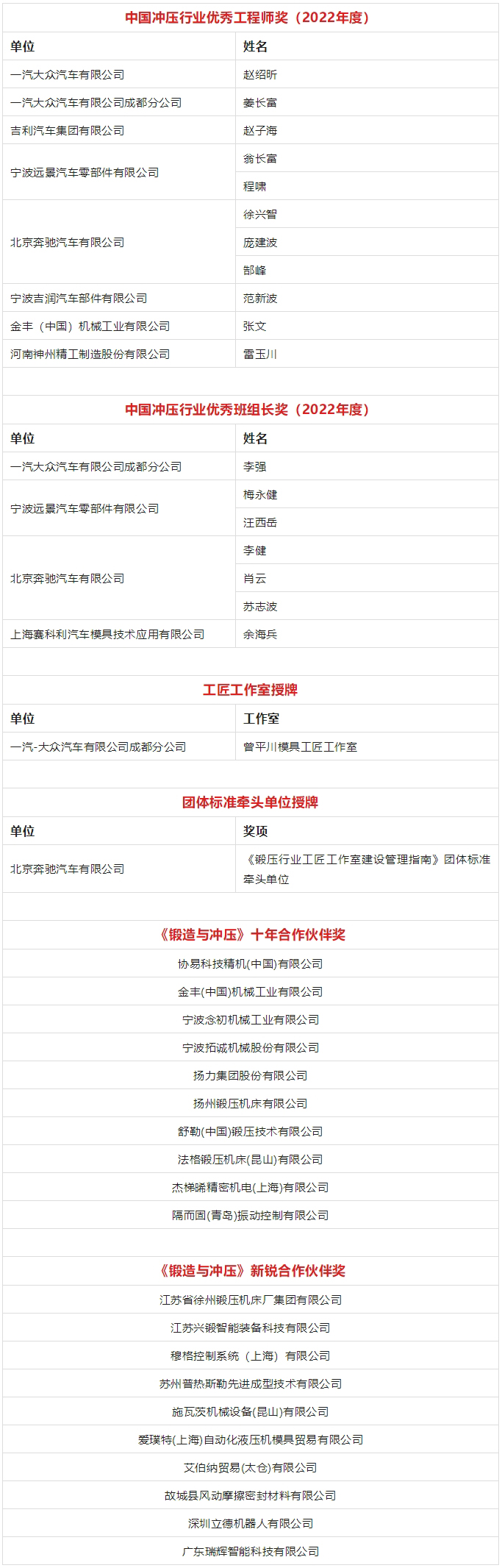 會議同期,舉行了中國沖壓行業(yè)優(yōu)秀工程師、優(yōu)秀班組長(2022年度)頒獎儀式,一汽-大眾汽車有限公司成都分公司——曾平川模具工匠工作室和《鍛壓行業(yè)工匠工作室建設管理指南》團體標準牽頭單位——北京奔馳汽車有限公司授牌儀式,以及《鍛造與沖壓》十年合作伙伴獎、新銳合作伙伴獎頒獎儀式。