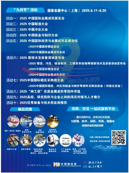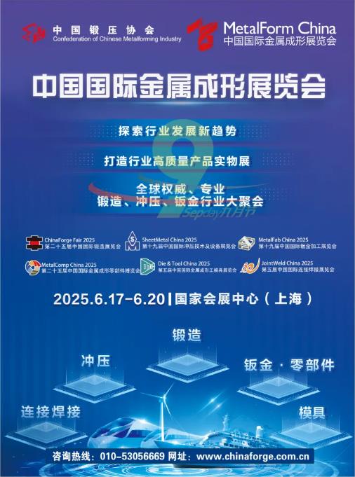 2025年中國國際金屬成形展覽會將于 2025 年6月17-20日繼續(xù)在國家會展中心(上海)舉辦,期待每一個行業(yè)同仁能夠積極參與,期待我們再次相聚!