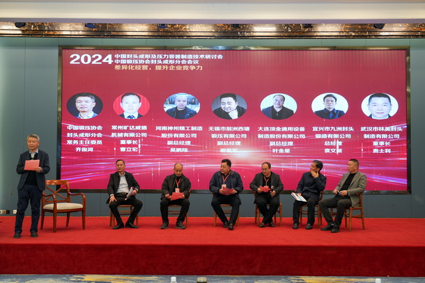 隨后,大會邀請了常州曠達威德機械有限公司董事長曹立宏、宜興市九洲封頭鍛造有限公司董事長袁文新、武漢市林美封頭制造有限公司董事長貴士利、無錫市前洲西塘鍛壓有限公司副總經(jīng)理謝愛軍、河南神州精工制造股份有限公司副總經(jīng)理吳鵬翔、大連頂金通用設(shè)備制造股份有限公司副總經(jīng)理葉金星等6家優(yōu)秀封頭制造企業(yè)家進行了圓桌會議討論,由中國鍛壓協(xié)會副理事長齊俊河主持,共同探討了關(guān)于未來市場發(fā)展、人才戰(zhàn)略、國際化戰(zhàn)略、信息化戰(zhàn)略等問題進行了熱烈的探討。