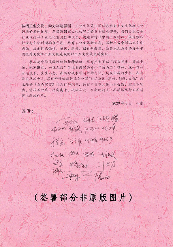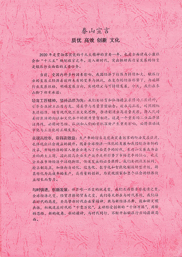 會(huì)上,以質(zhì)優(yōu)、高效、創(chuàng)新、文化為主題發(fā)布了《泰山宣言》,號(hào)召鍛壓行業(yè)要堅(jiān)守工匠精神,堅(jiān)持品質(zhì)為先,對(duì)照國(guó)際先進(jìn)標(biāo)準(zhǔn),推動(dòng)制造業(yè)高質(zhì)量發(fā)展;要實(shí)現(xiàn)高效率,獲得高效益,擁抱互聯(lián)網(wǎng),搶占制高點(diǎn),加快向數(shù)字化、自動(dòng)化和信息化造轉(zhuǎn)型升級(jí),從而逐步實(shí)現(xiàn)智能化制;要與時(shí)俱進(jìn),創(chuàng)新發(fā)展,與新經(jīng)濟(jì)共舞,和新文明共振;要弘揚(yáng)工業(yè)文化,促進(jìn)鍛壓行業(yè)與文化創(chuàng)新融合發(fā)展,培育工業(yè)文化新業(yè)態(tài),助力制造強(qiáng)國(guó)建設(shè)。