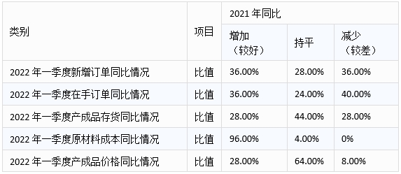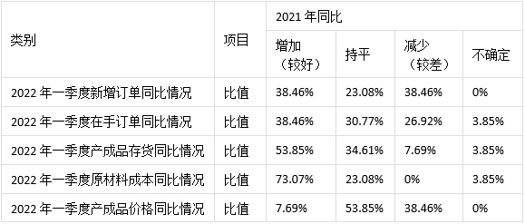 38.46%的企業(yè)表示2022年一季度新增訂單同比增加,表示持平的企業(yè)為23.08%,38.46%的企業(yè)則表示有所減少;38.46%的企業(yè)表示2022年一季度在手訂單同比增加,30.77%的企業(yè)表示持平,26.92%的企業(yè)則表示有所減少,另有3.85%的企業(yè)無法確定;53.85%的企業(yè)2022年一季度產(chǎn)成品存貨同比增加,34.61%的企業(yè)表示持平,7.69%的企業(yè)表示減少,另有3.85%的企業(yè)無法確定。這些數(shù)據(jù)表明大多數(shù)鈑金制作裝備企業(yè)2022年一季度延續(xù)了2021年末的訂單形勢,同比2021年一季度,超過半數(shù)的企業(yè)產(chǎn)成品庫存有所增加。