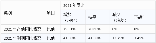 參與調(diào)研的沖壓裝備企業(yè)中,79.31%的企業(yè)表示2021年產(chǎn)值同比有所增加,20.69%的企業(yè)表示持平,沒有企業(yè)表示減少;41.38%的企業(yè)2021年利潤同比增加,同樣41.38%的企業(yè)表示利潤持平,13.79%的企業(yè)表示減少,另3.45%的企業(yè)表示不確定。這些數(shù)據(jù)表明2021年沖壓裝備企業(yè)大多產(chǎn)值保持了增長態(tài)勢,但利潤增加的只有四成左右,這可能與原材料價(jià)格上漲及市場競爭激烈導(dǎo)致價(jià)格戰(zhàn)等因素有關(guān)。具體分布情況見表2.1。