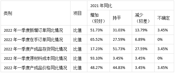 51.73%的企業(yè)表示2022年一季度新增訂單同比增加,31.03%的企業(yè)表示持平,13.79%的企業(yè)表示減少,3.45%的企業(yè)則表示不確定;65.52%的企業(yè)表示2022年一季度在手訂單同比增加,27.59%的企業(yè)表示持平,6.89%的企業(yè)表示減少;51.73%的企業(yè)2022年一季度產(chǎn)成品存貨同比持平,表示減少的企業(yè)為27.59%,17.23%的企業(yè)表示增加,3.45%的企業(yè)則表示不確定。這些數(shù)據(jù)表明2022年一季度沖壓裝備企業(yè)延續(xù)了2021年末較好的發(fā)展態(tài)勢,但新增訂單方面已開始有所減緩,同時(shí)產(chǎn)成品存貨相比去年同期則較為平穩(wěn)。